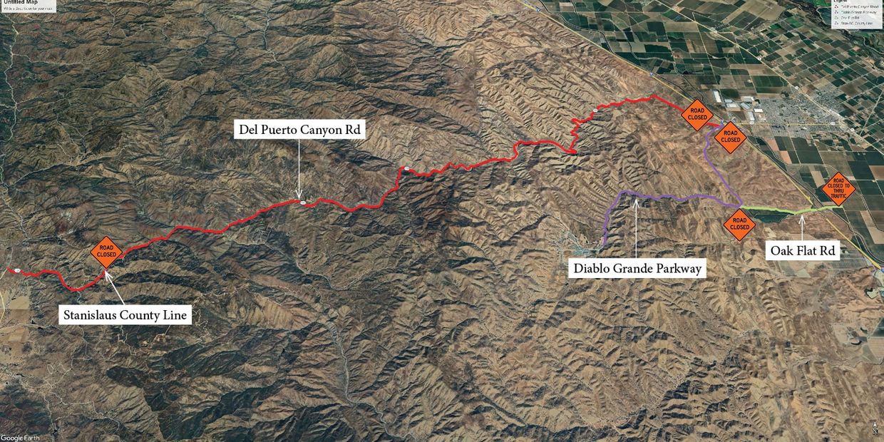 If Del Puerto Canyon Road needs to be closed, closure points should be set up at both ends of the road in the project area: at the Stanislaus County Line on the west end and at the junction with Diablo Grande Parkway on the east end.